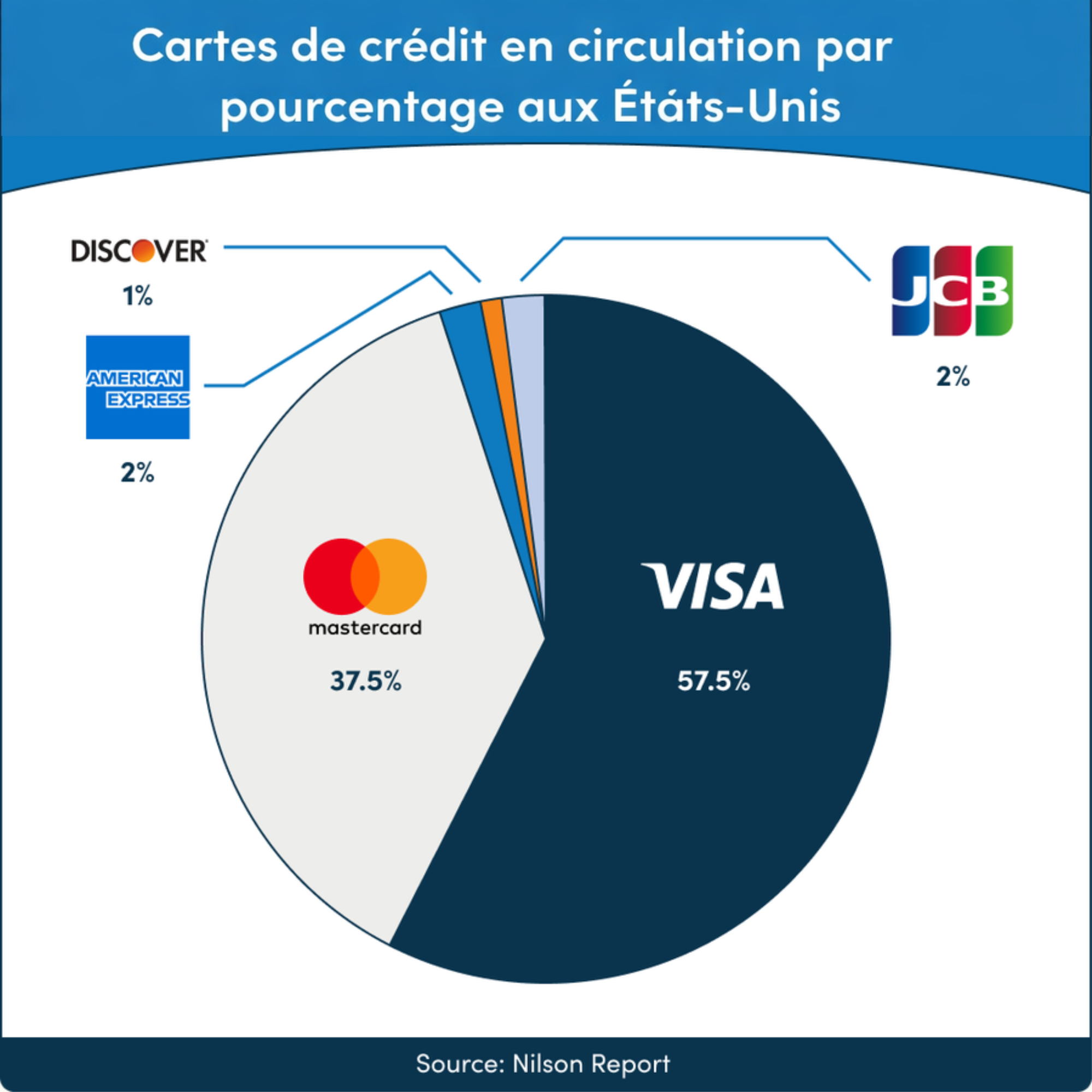 Aux États-Unis, plus d’une carte sur deux en circulation passe par le réseau Visa, illustrant son effet de réseau massif :