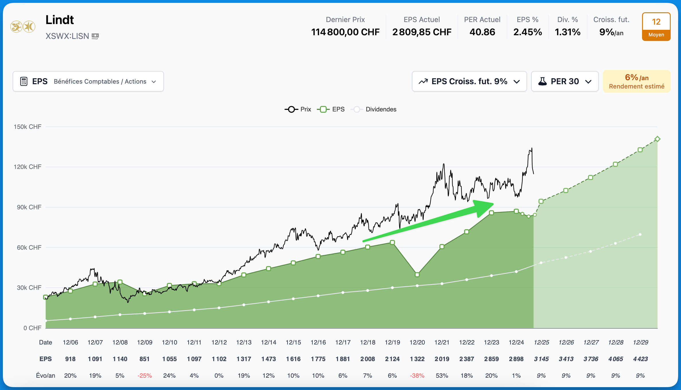 Sur 20 ans, les bénéfices par action (EPS) de Lindt ont suivi une croissance régulière (courbe verte) et les crises (2008, Covid, inflation) n’ont été que des pauses temporaires dans l'évolution des bénéfices.