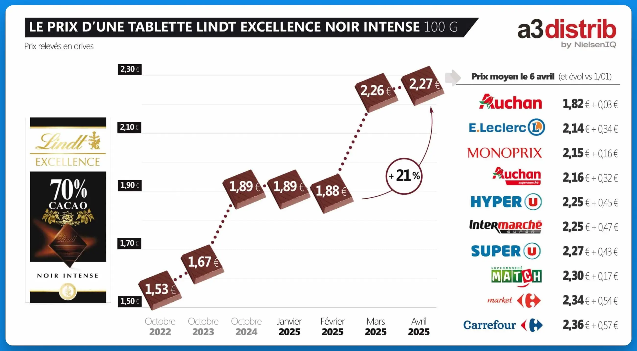 Voici par exemple l'évolution du prix d'une tablette Lindt de 2022 à 2025 :
