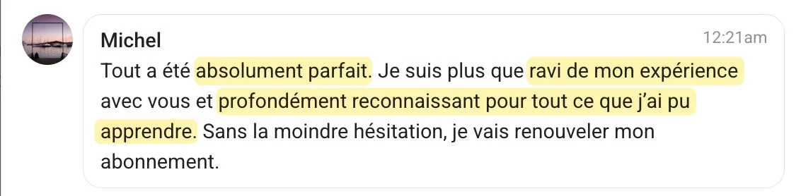 PS : Voici le retour que nous a fait Michel cette semaine avant de renouveler son abonnement à la Méthode Trident :