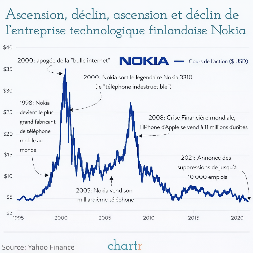 Nokia a dominé le marché du téléphone mobile à la fin des années 1990, avec un pic en bourse pendant la bulle internet, avant de s’effondrer avec l’arrivée du premier IPhone en 2007.