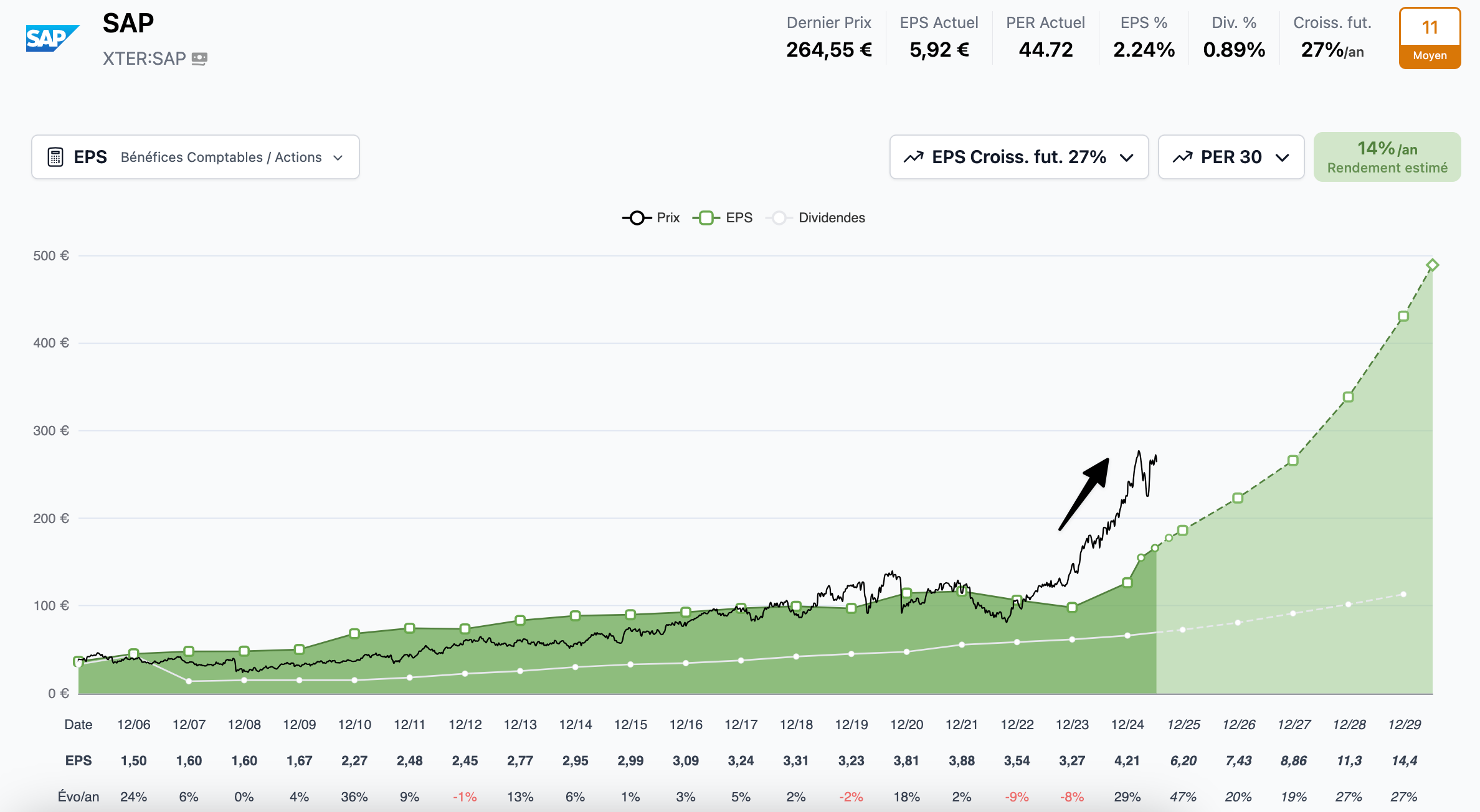 Par contre, sa note trident reste plutôt faible (11/20) car SAP a eu du mal à faire croître rapidement ses bénéfices et son Free Cash Flow par le passé.