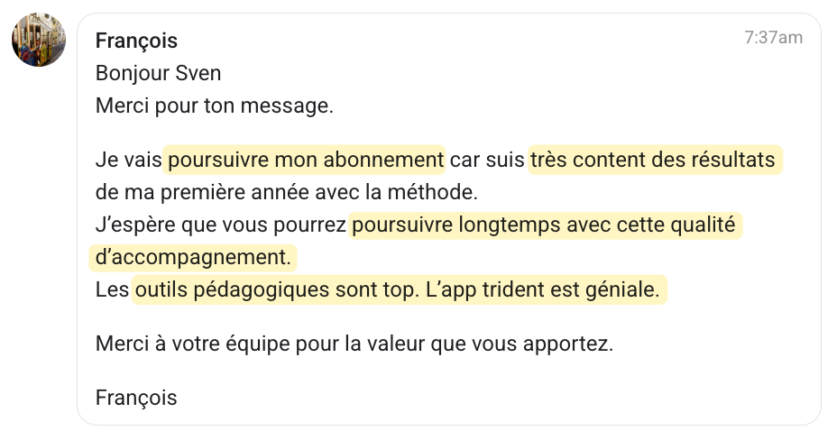 PS : Voici le retour que nous a fait François cette semaine avant de renouveler son abonnement à la Méthode Trident :