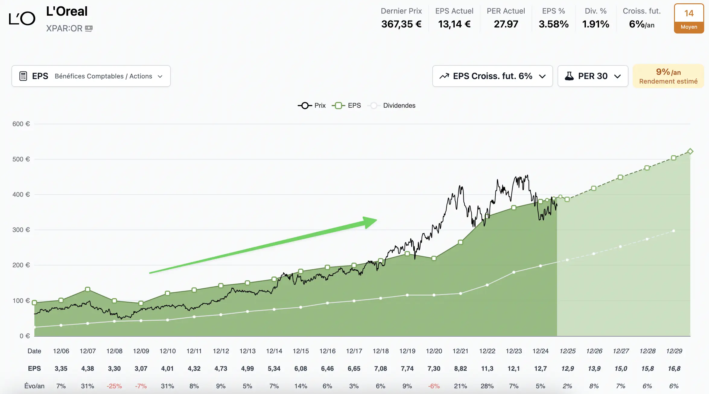 Ici on voit que sur les 20 dernières années (hors crises majeures comme 2008 ou le Covid), les bénéfices de l'Oréal n'ont fait qu'augmenter.