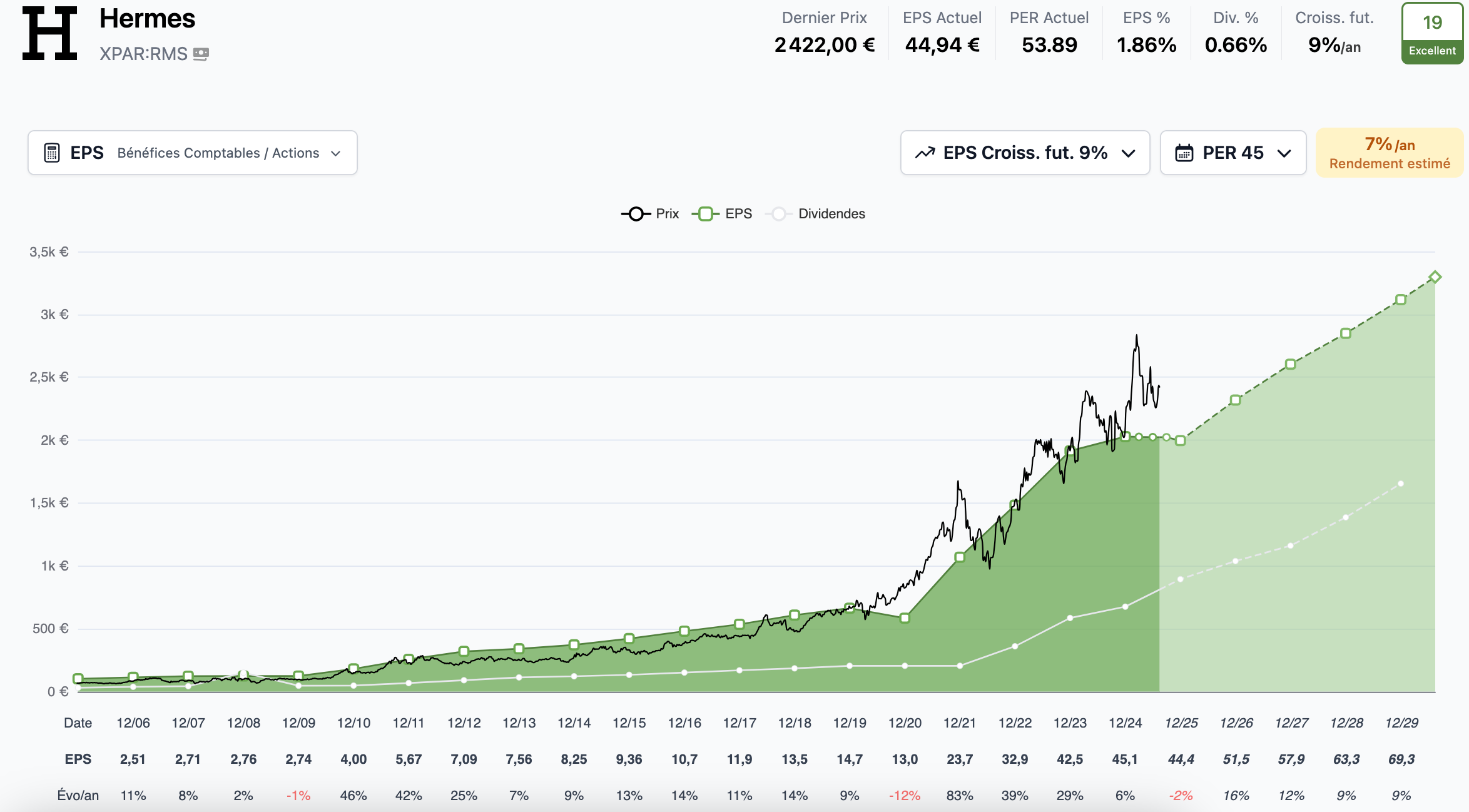 Rendement Trident estimé : 7%/an (en supposant un PER qui reste élevé à 45)
