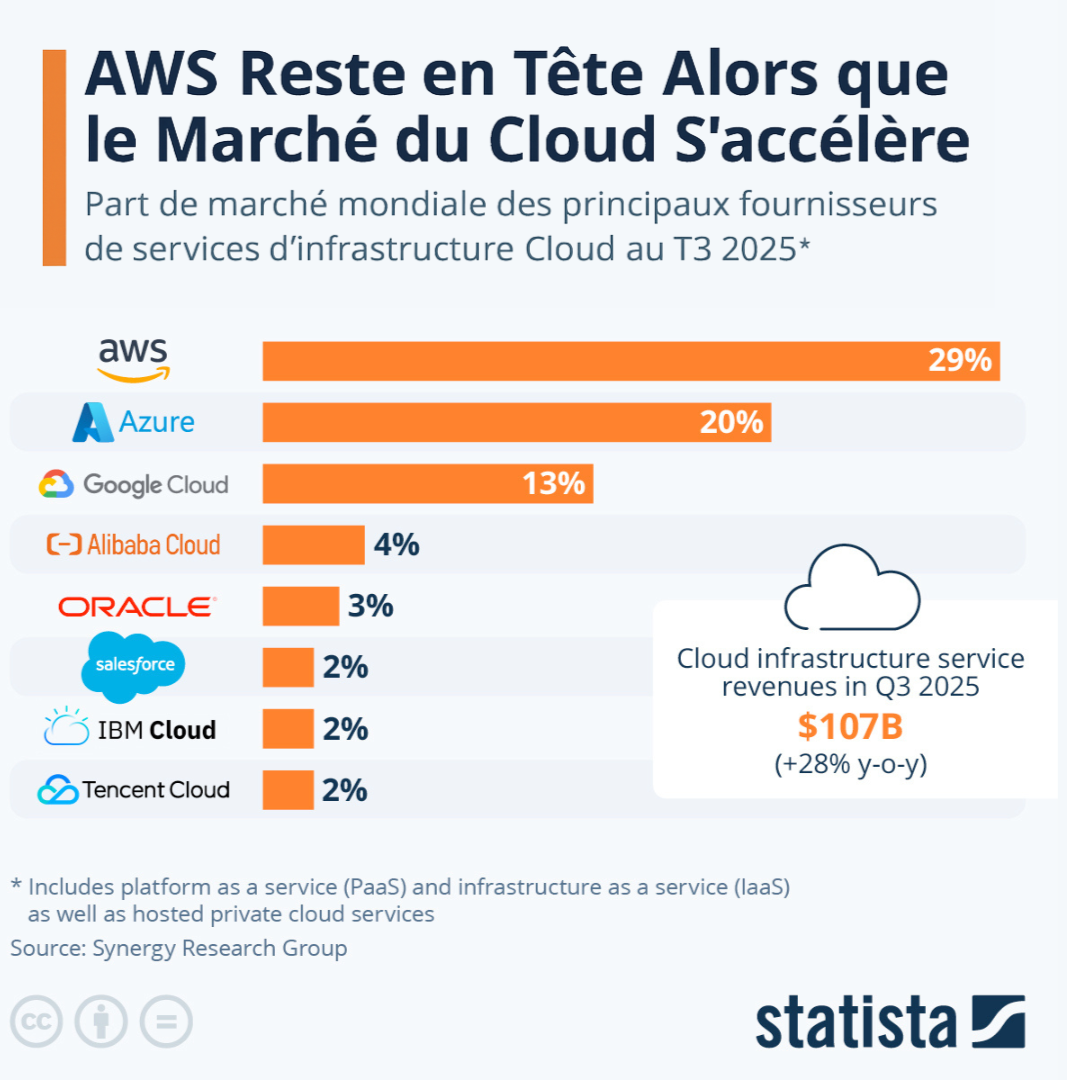 En 2025, AWS (Amazon) et Azure contrôlent à elles seules la moitié du cloud mondial.