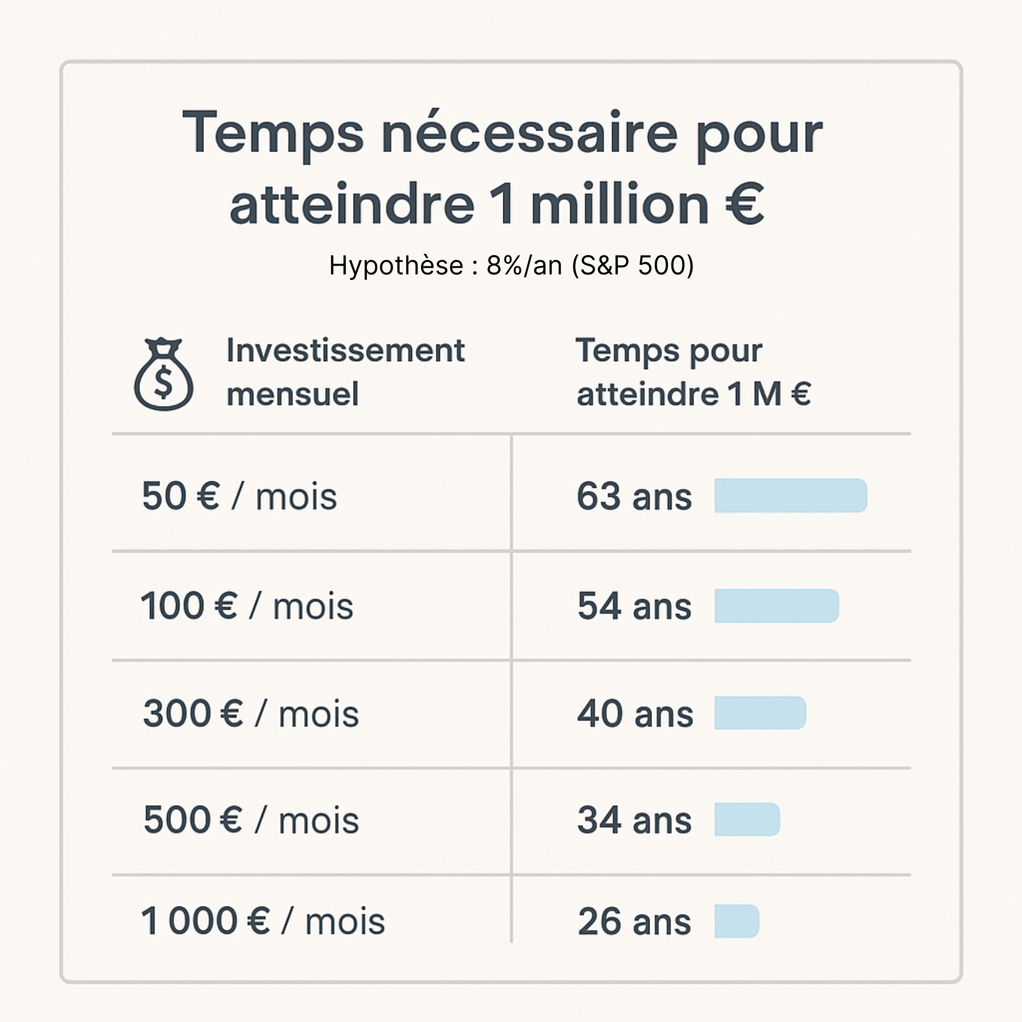 En passant de 50€/mois à 1000€/mois, vous mettez 2x moins de temps pour atteindre 1M€.