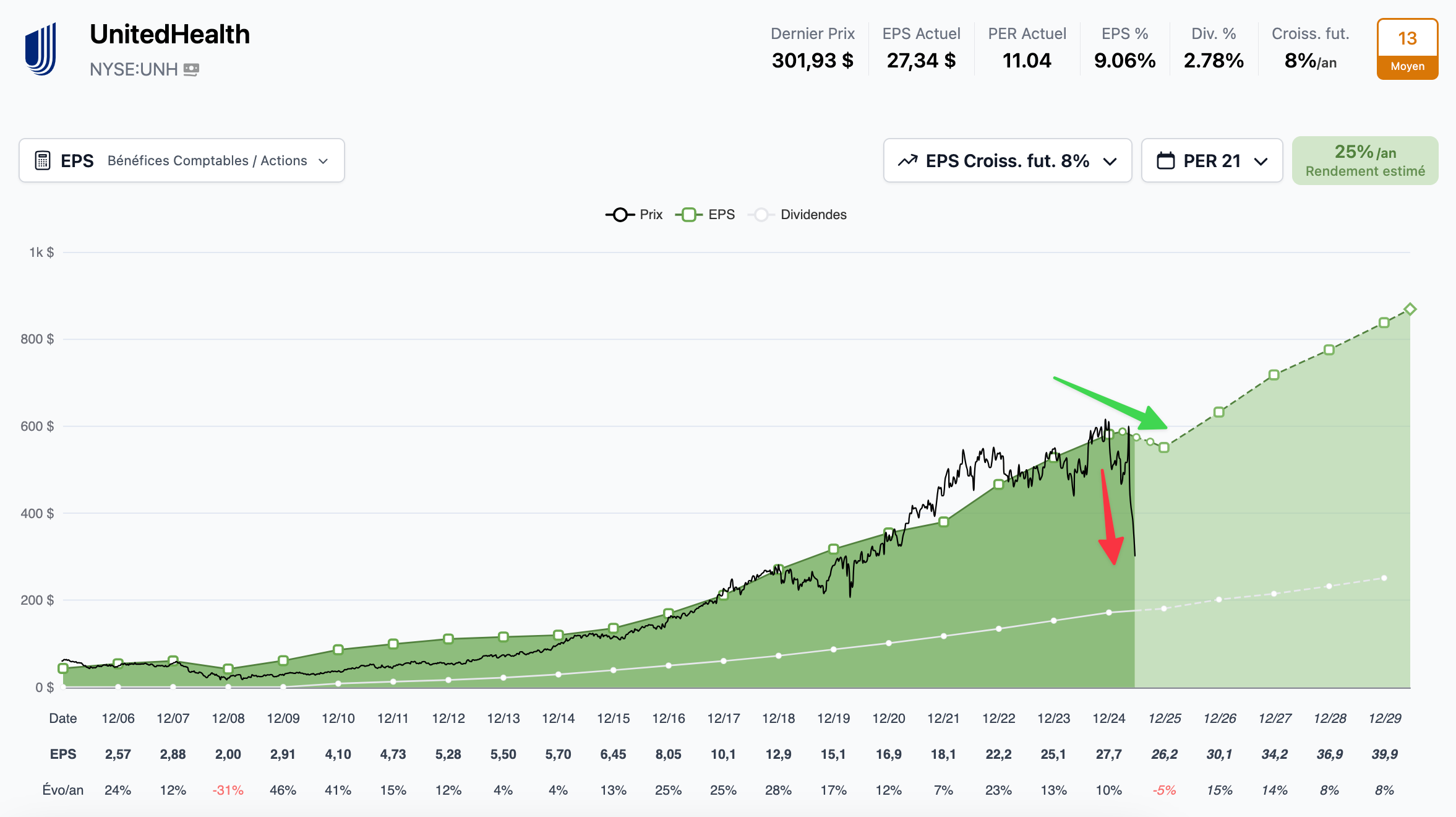 UnitedHealth reste une machine à cash avec plus de $20 Mds de Free Cashflow générés en 2024 et une croissance des bénéfices de 17%/an sur les 10 dernières années.