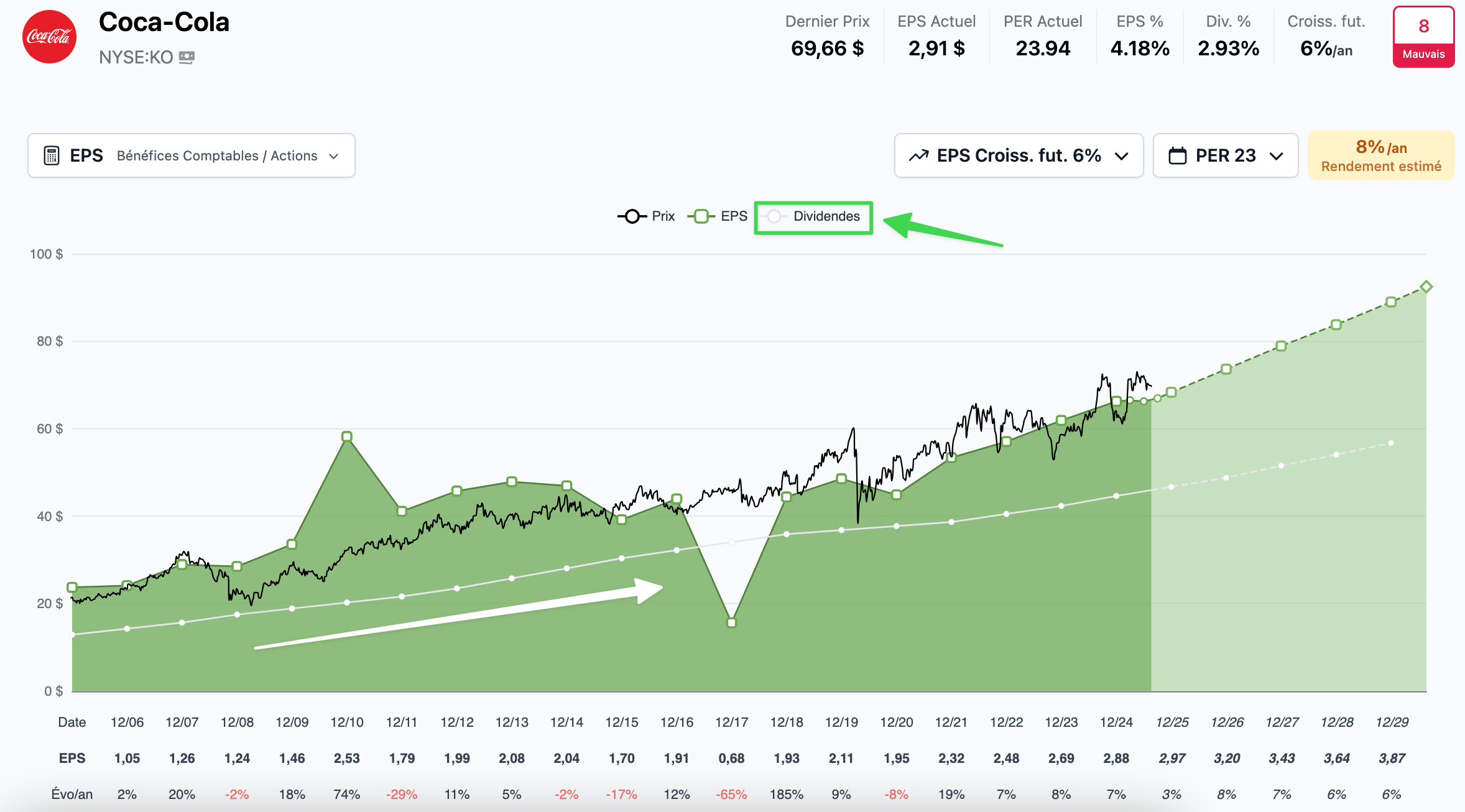 💸 Un dividende en hausse chaque année depuis 61 ans maintenant (courbe blanche).