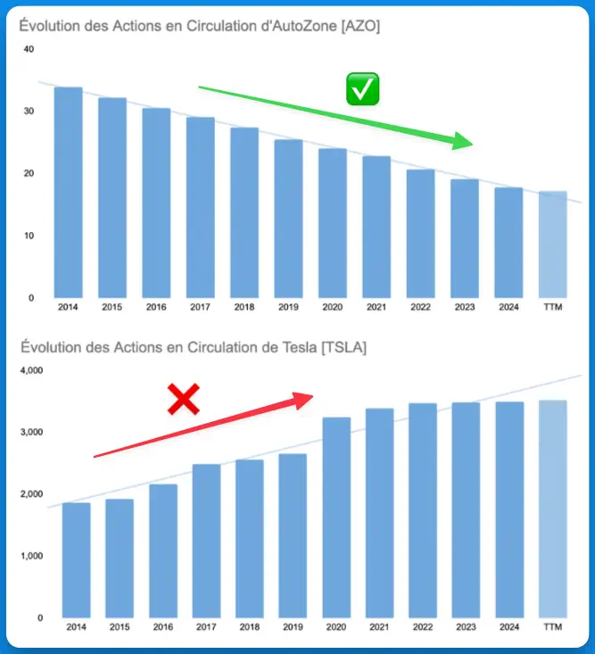 Entre 2019 et 2024, le nombre d’actions en circulation est passé d’environ 667 millions à 1,2 milliard (+80 %).