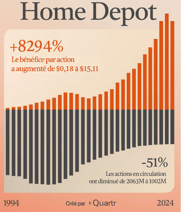 son bénéfice par action est passé de 0,18 $ à 15,11 $ (+8 294 % soit 15,7 %/an) alors que son bénéfice brut n'a augmenté que de 9,7 % sur la même période.